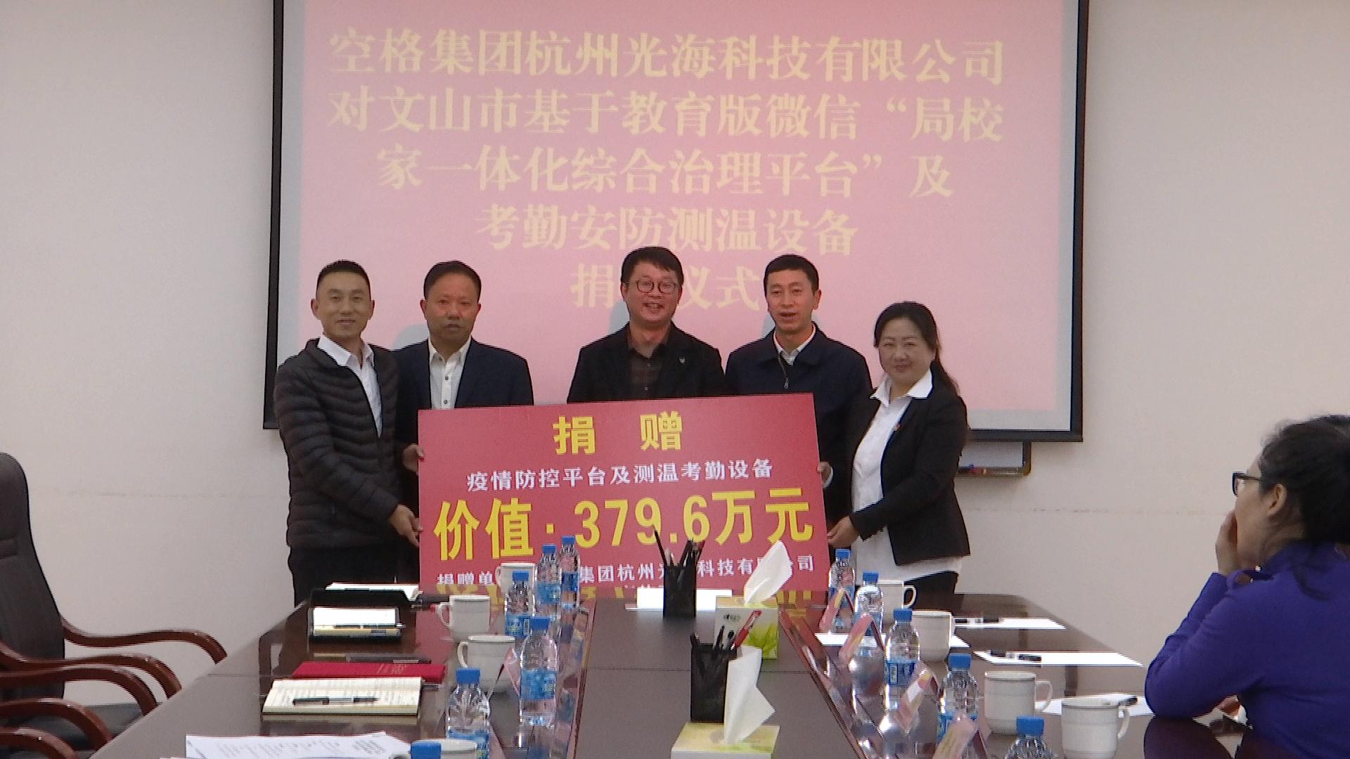 为扶持文山市教育事业,杭州光海科技有限公司大区总经理金春辉一行远道而来,为文山市捐赠价值379.6万元的基于教育版微信局校家一体化综合治理平台及考勤安防测温设备。
