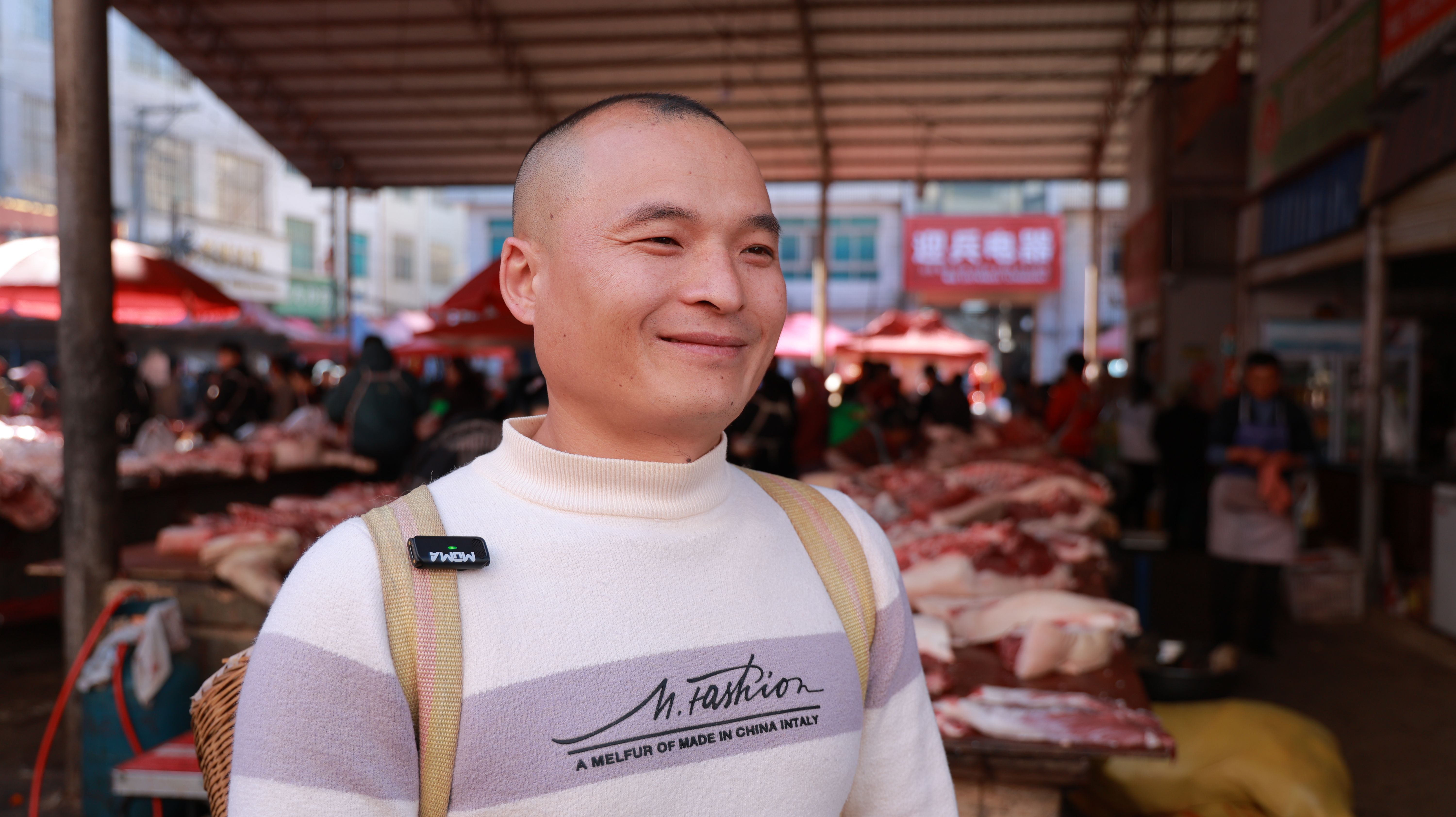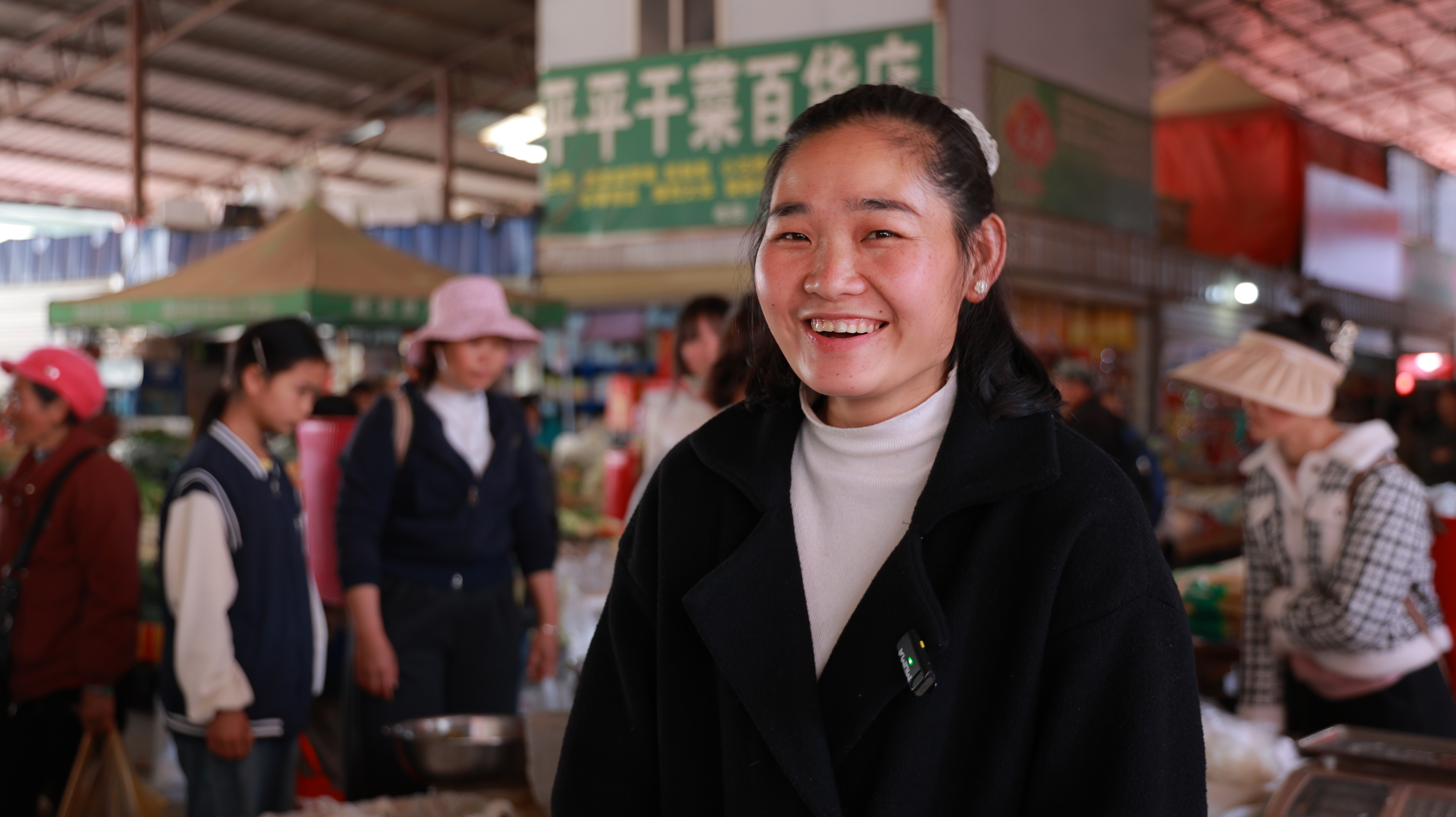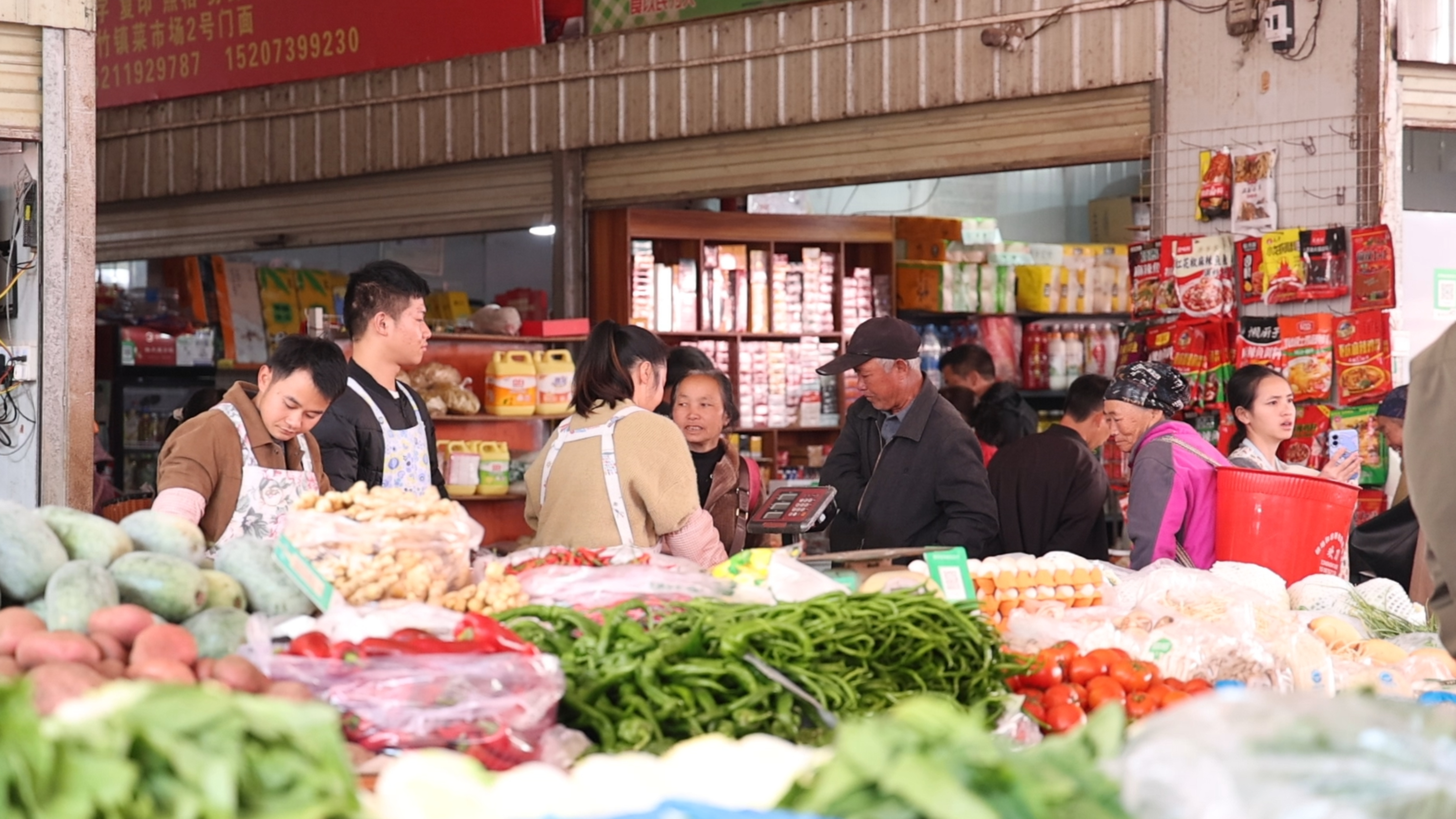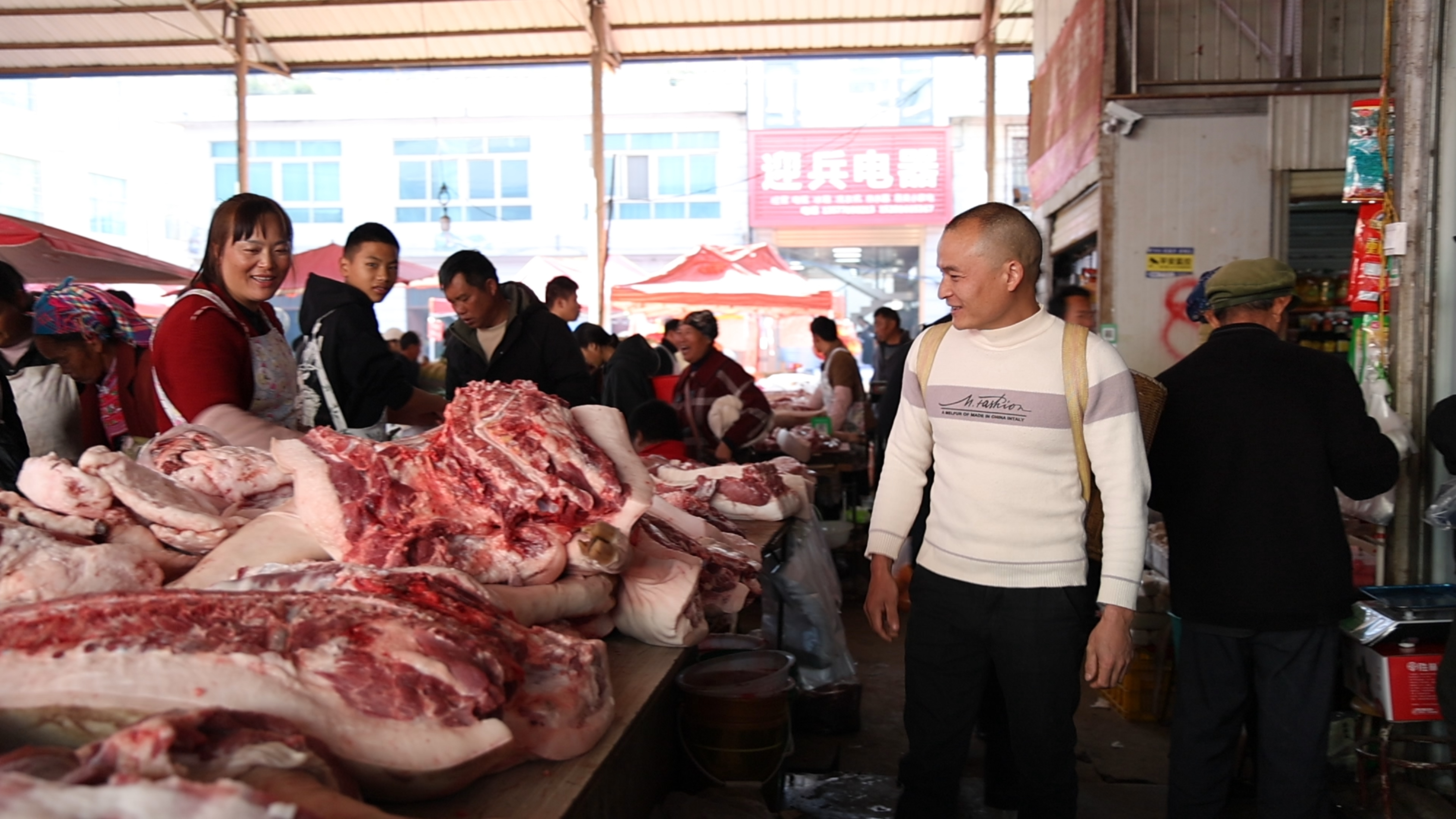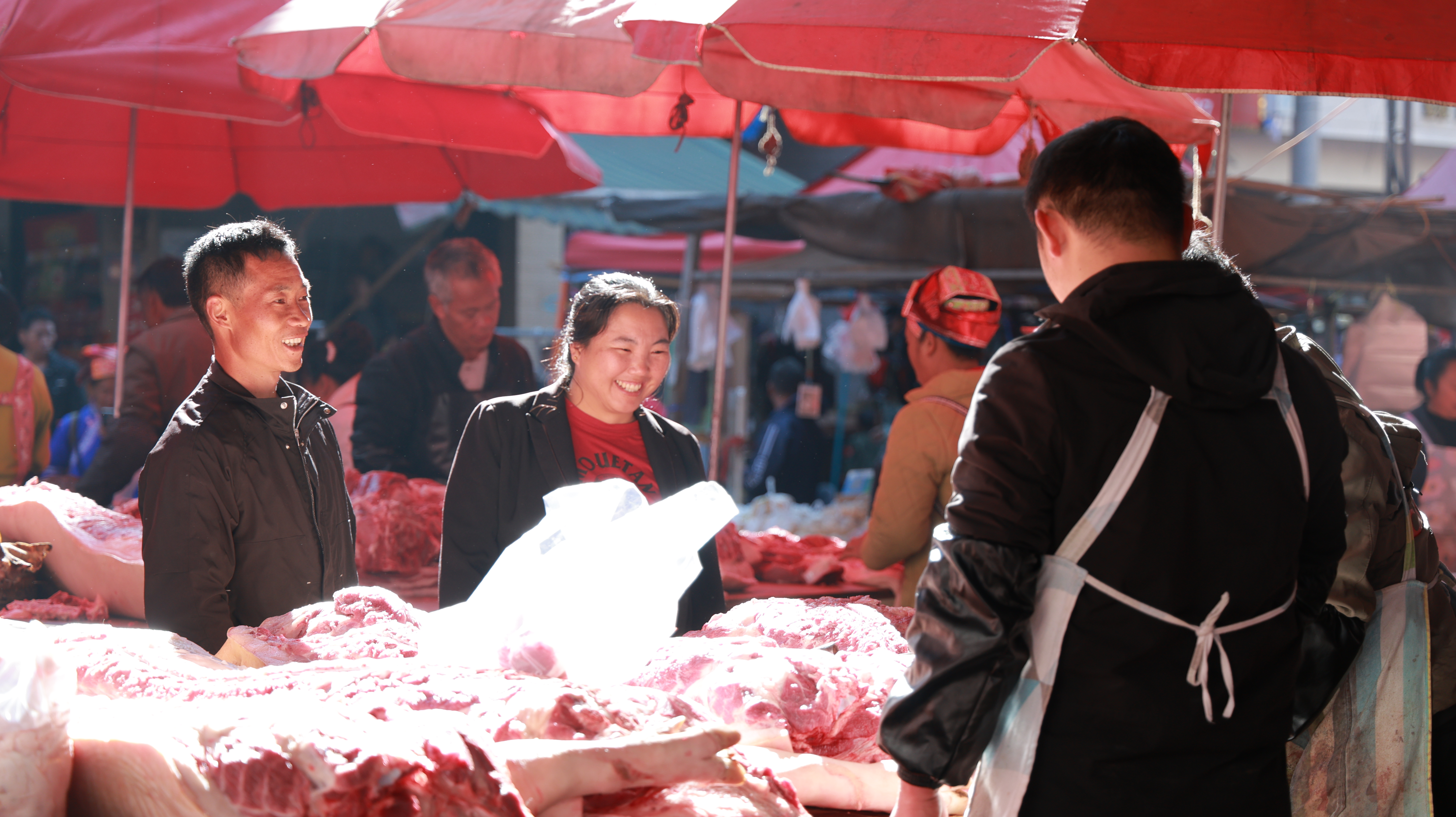 在老街集市里,菜摊、肉摊前同样人声鼎沸。青蒜、白菜、萝卜等小菜整齐摆放,新鲜透亮让人忍不住购买。人们背着的背篓里装满了年货,手里还提着装满东西的塑料袋,遇到心仪的东西,还不时驻足俯身挑选。