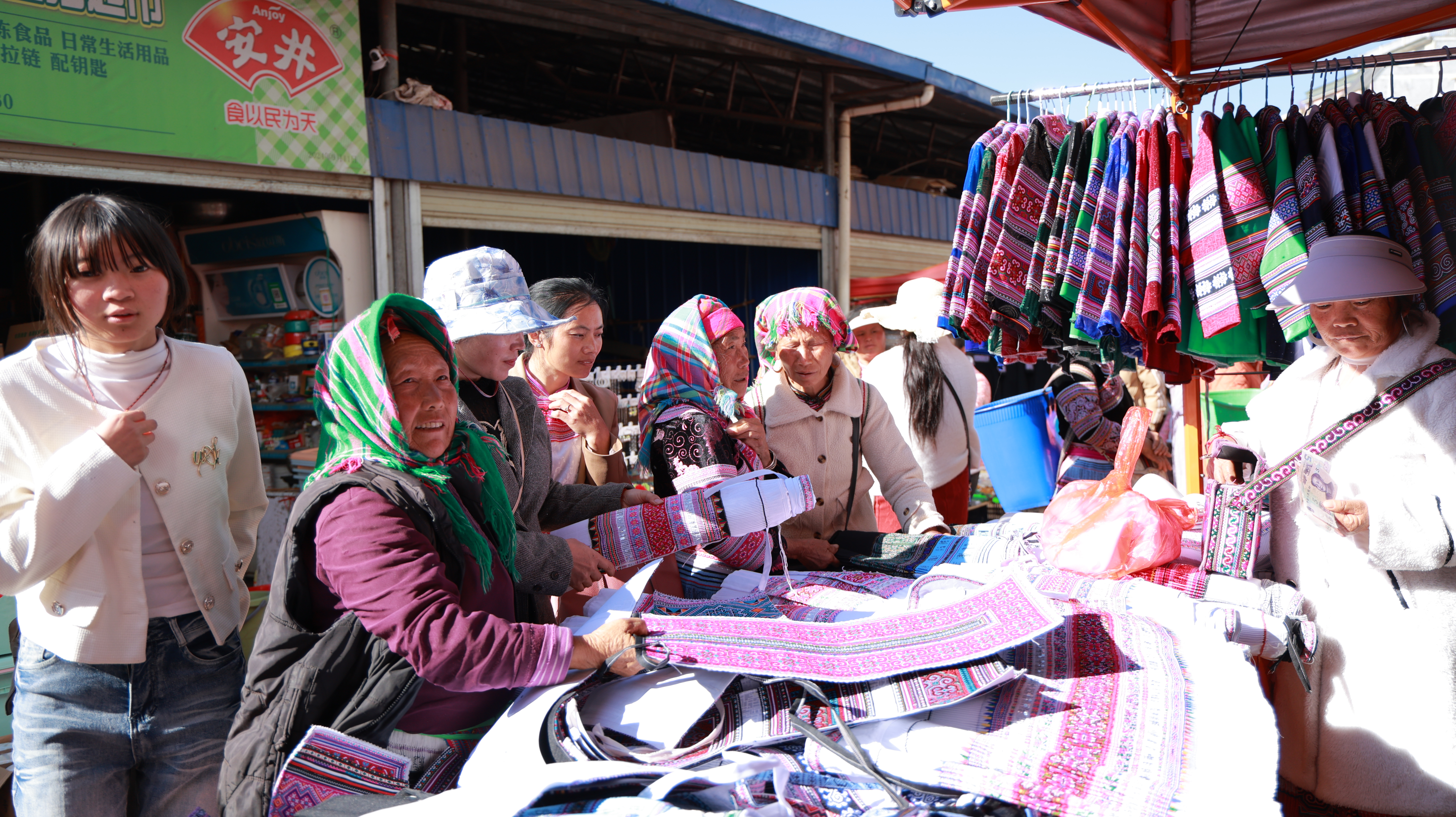 侯占麦老人说,过年买新衣服是他们世代相传的习俗,能在新年讨个好彩头,寄托着对新一年风调雨顺、健康快乐的美好祈愿。而这身新衣服还是她春节期间去“踩花山”要穿的“战袍”,所以她要好好挑选。